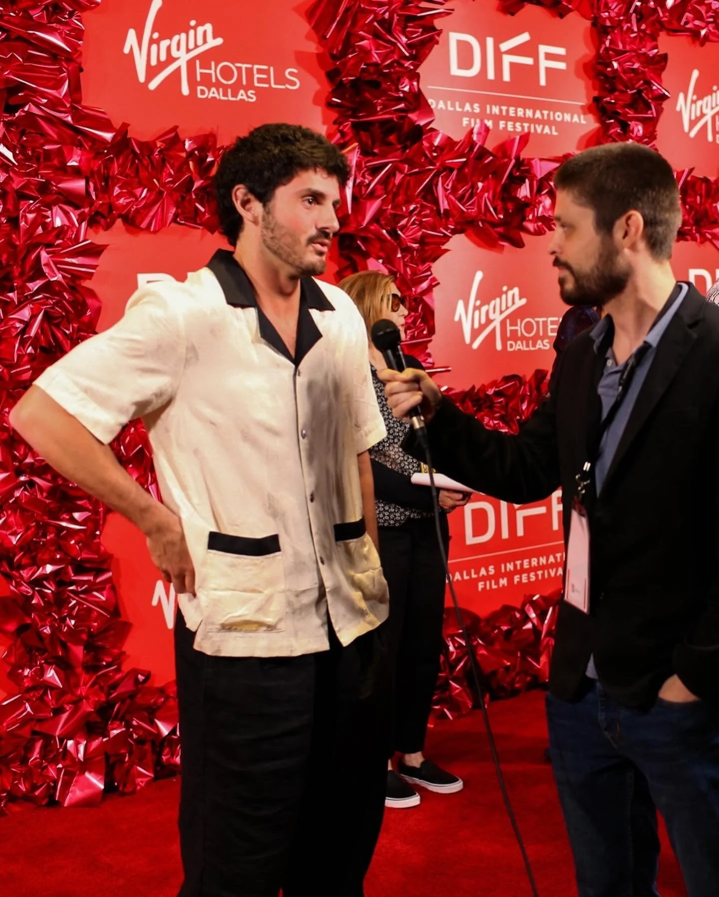 Two men are being interviewed at the Dallas International Film Festival with a red backdrop that has the logos of Virgin Hotels Dallas and the film festival. One man is dressed in a cream-colored short-sleeve shirt with black accents, and the other in a dark blazer.